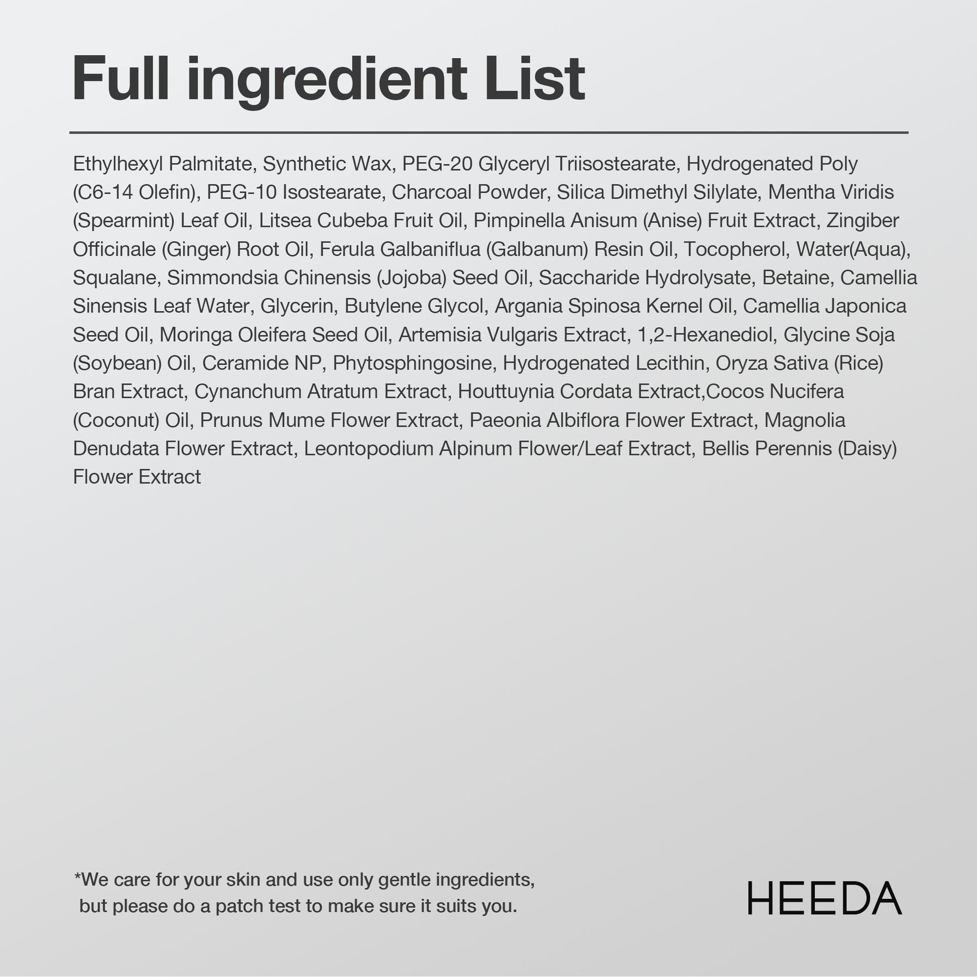 Ethylhexyl Palmitate, Synthetic Wax, PEG-20 Glyceryl Triisostearate, Hydrogenated Poly(C6-14 Olefin), PEG-10 Isostearate, Charcoal Powder, Silica Dimethyl Silylate, Mentha Viridis (Spearmint) Leaf Oil, Litsea Cubeba Fruit Oil, Pimpinella Anisum (Anise) Fruit Extract, Zingiber Officinale (Ginger) Root Oil, Ferula Galbaniflua (Galbanum) Resin Oil, Tocopherol, Water(Aqua), Squalane, Simmondsia Chinensis (Jojoba) Seed Oil, Saccharide Hydrolysate, Betaine, Camellia Sinensis Leaf Water, Glycerin, Butylene Glycol, Argania Spinosa Kernel Oil, Camellia Japonica Seed Oil, Moringa Oleifera Seed Oil, Artemisia Vulgaris Extract, 1,2-Hexanediol, Glycine Soja (Soybean) Oil, Ceramide NP, Phytosphingosine, Hydrogenated Lecithin, Oryza Sativa (Rice) Bran Extract, Cynanchum Atratum Extract, Houttuynia Cordata Extract,Cocos Nucifera (Coconut) Oil, Prunus Mume Flower Extract, Paeonia Albiflora Flower Extract, Magnolia Denudata Flower Extract, Leontopodium Alpinum Flower/Leaf Extract, Bellis Perennis (Daisy) Flower Extract